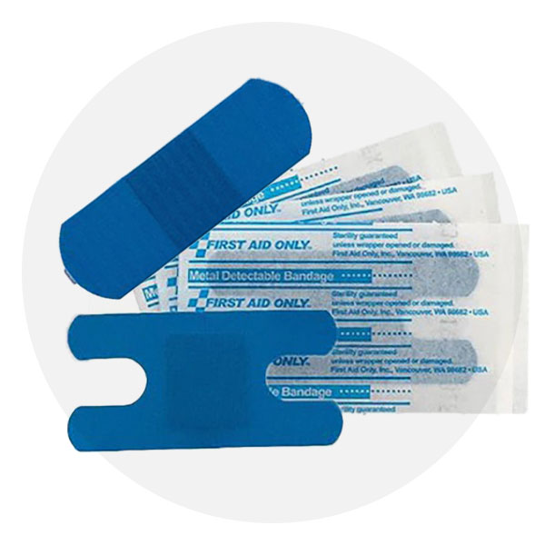 Blue metal detectable bandages offer a dual foreign object detection system, optimizing food safety. The bright blue color of the metal detectable bandages is the most common non-food color, enhancing the likelihood of visual detection. Additionally, the metal detectable properties incorporated in the bandage materials provide an added level of safety and detectability.