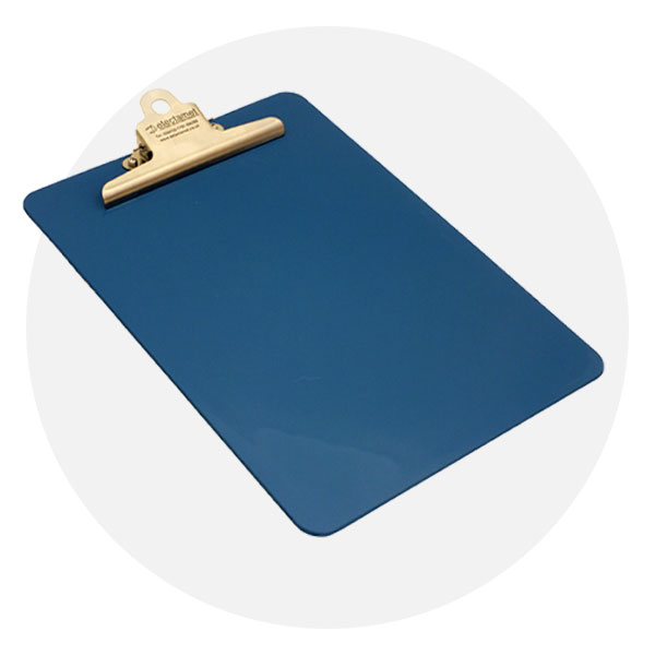 Any plastic clipboard can be customized by choosing from various colors, clips, ring binder mechanisms, and hanging hooks. You can have your company name or a series of sequential numbers engraved for further personalization.